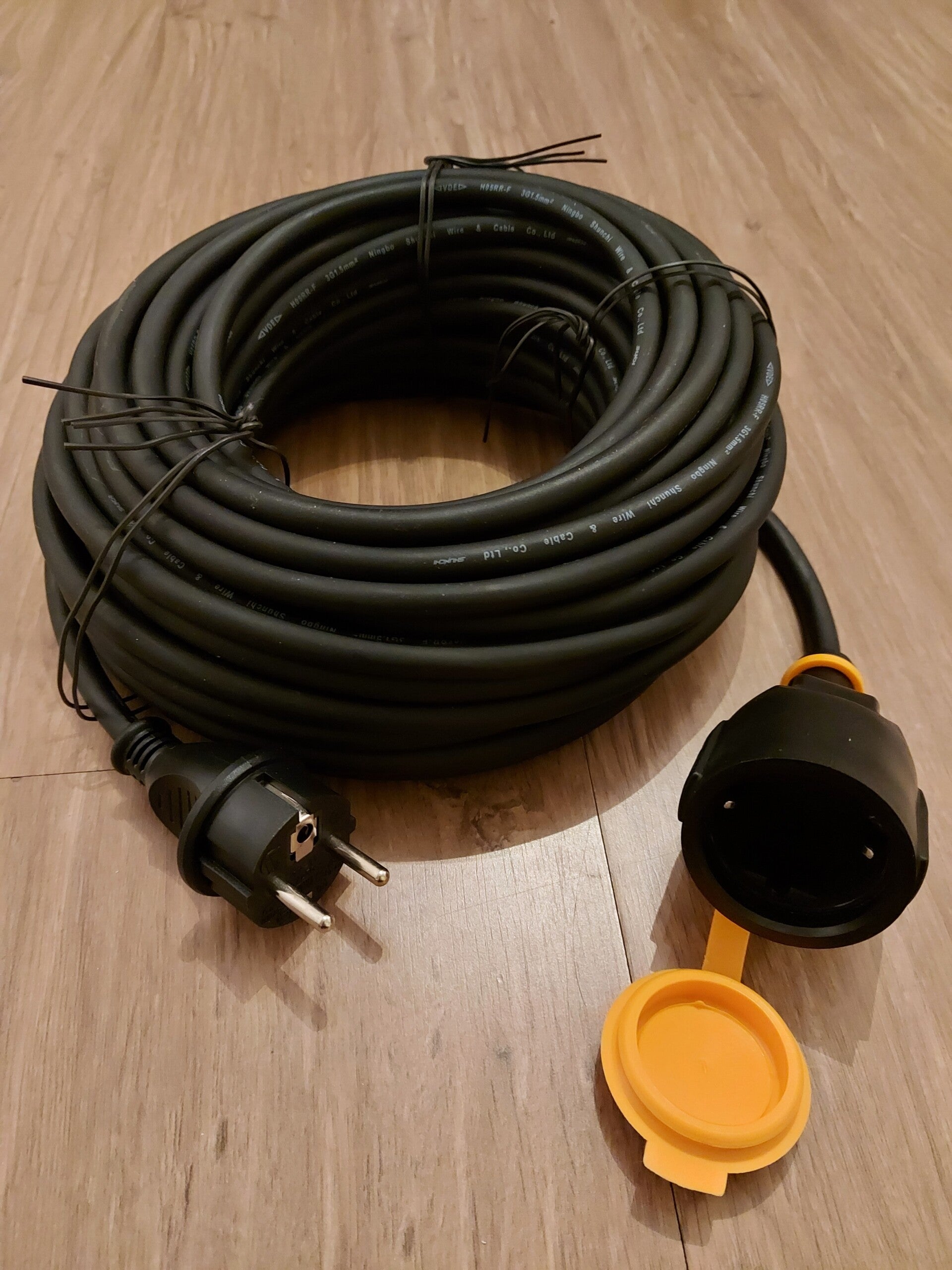 Verlengsnoer van 20 meter lang. De verlengsnoer kan belast worden tot 3200 Watt.